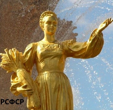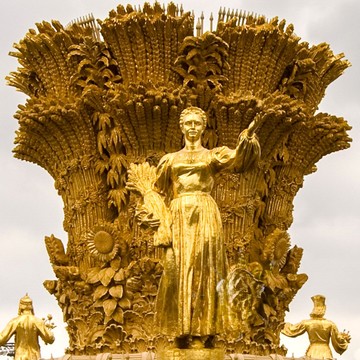 В центре большого восьмигранного бассейна размещён овальный фонтан. На ступенчатом основании из красного гранита установлен чашеобразный сноп из пшеницы, подсолнухов и технической конопли, вокруг снопа 16 женских скульптур выполненных из бронзы и покрыты сусальным золотом, олицетворяющие союзные республики, они одеты в национальные наряды и имеют характерные черты лица, в руках они держат сельскохозяйственное растение, которое чаще всего выращивалась на полях ее родной республики.