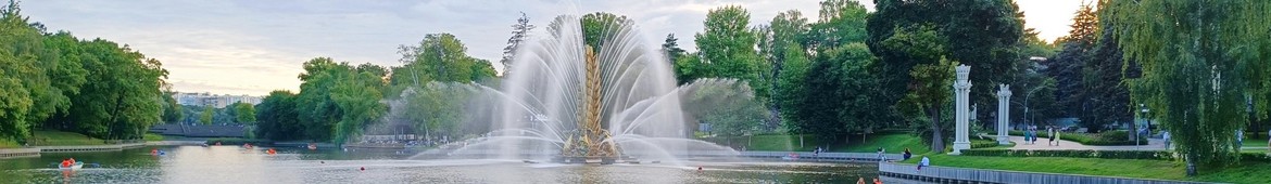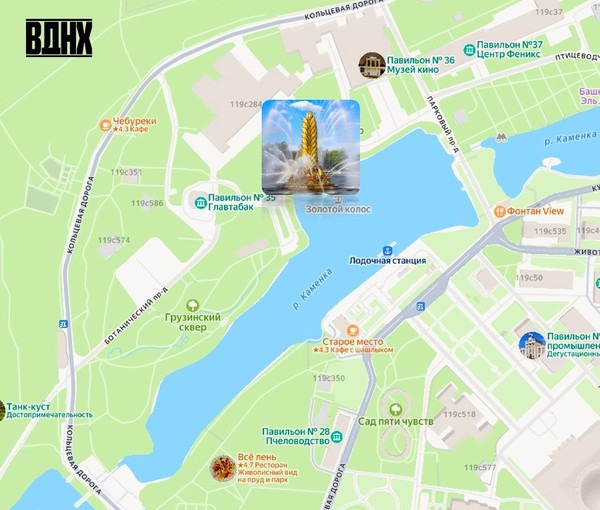 Фонтан «Золотой колос» расположен в центре Каменского пруда №3 Ландшафтного парка ВДНХ.