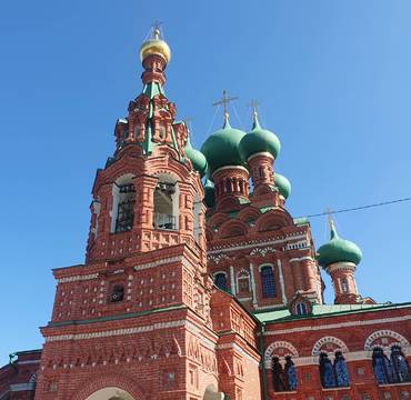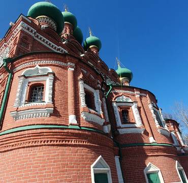 Красиво декорированный пятиглавый храм из красного кирпича с шатровой колокольней построен 1692 году. Спустя некое время к храму пристроили несколько крылец, галерею, и шатровую колокольню (шатровое завершение колокольни в 1739 году было разобрано и к 1754 году заменено на новое двухъярусное в стиле барокко.) Данный храм является памятником старорусского культового зодчества.