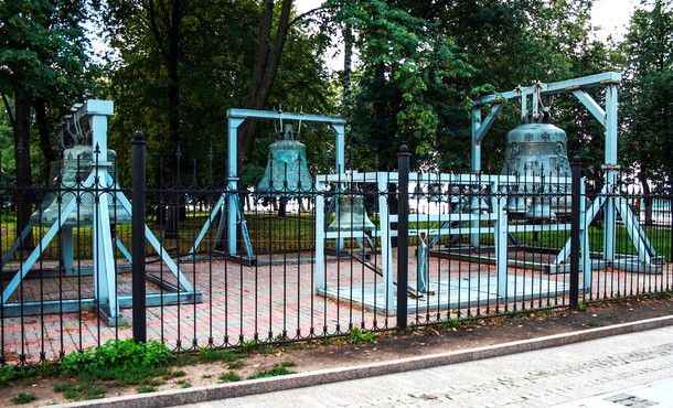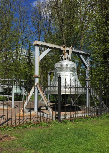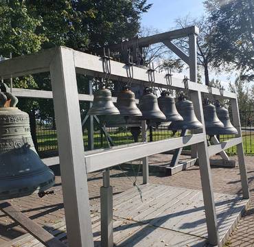 Два больших колокола держатся на индивидуальных металлических конструкциях. Еще один каркас служит опорой для трех колоколов среднего размера. На соседней конструкции находятся семь маленьких колоколов.