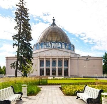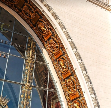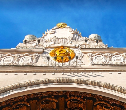Входом в павильон со стороны площади служила большая декорированная арка с двумя постаментами виде башен украшенные барельефами на тему механизации на которых стоят скульптуры Тракториста и Комбайнёрки. По центру арки находится барельеф окружённых цветами, колосьями и лентами. А герба СССР с профилем Ленина и Сталина, который был в центре барельефа до настоящего времени не сохранился.