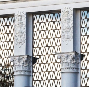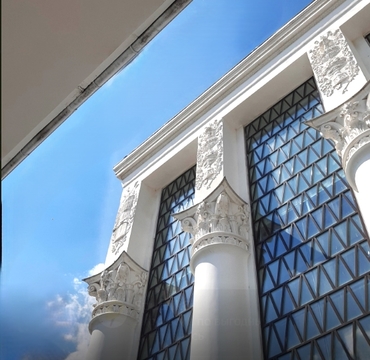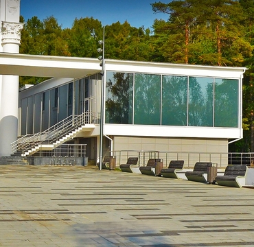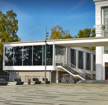 Архитектурно павильон смешал в себе два стиля, основной объем в стиле сталинского ампира и представляет собой высокое квадратное центральное здание, фасады которого украшены колоннами коринфского ордера, между колоннами расположены окна практически во всю высоту здания, а по бокам два застекленных флигеля, в стиле советского модернизма. Левый и правый флигель соединяются перекрытием, которое подпитается по центру колонной.