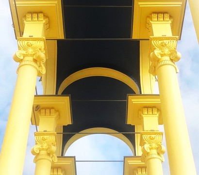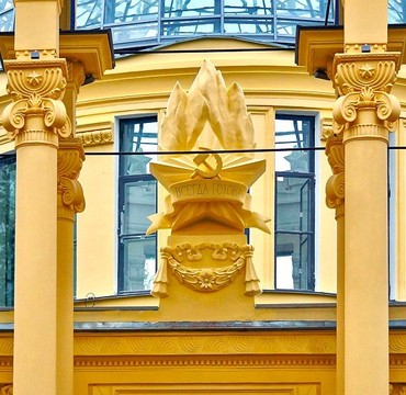 На входной группой, в центре на небольшом постаменте пионерский значок 40-х и 60-х годов прошлого века виде звезды с серпом и молотом и лентой с надписью «Всегда готов» с языками пламени.