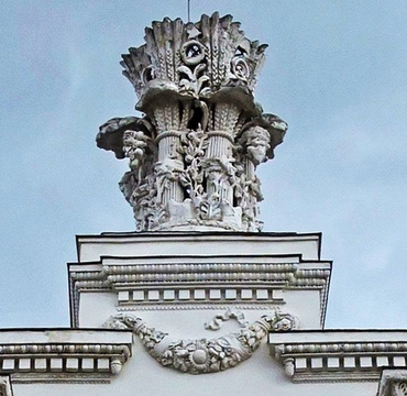 Само здание представляет собой шестиугольник, центральный фасад с шестью колоннами пышно декорирован лепниной, над каждой колонн размещены барельефы с изображениями охотника, механизатора, колхозницы, животновода, агронома и шахтёра. Увенчан главный фасад скульптурной композицией виде снопа.