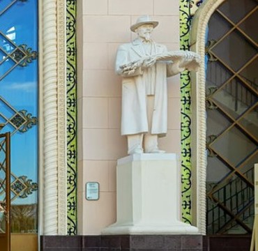 Главный фасад был оформлен в виде арок с лева и права украшен барельефами с этническими орнаментами, при входе в павильон встречают два памятника поэту Джамбулу Джабаеву и передовику сельскохозяйственного производства Чиганаку Берсиеву. На крыше павильона с права скульптура колхозницы с лева скульптора сталевара, в центральной части большой прозрачный стеклянный купол увенчанный позолоченным шпилем.
