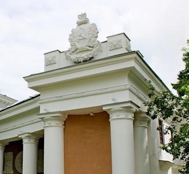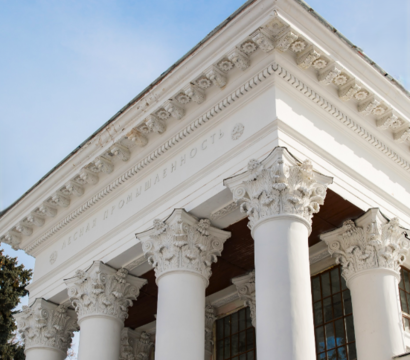 В архитектурном плане здание имеет полукруглую форму, в центре главный фасад здания, с четырьмя высокими колоннами с коринфскими капителями с верху портик. Венчает центральную часть павильона скульптурная композиция юноша и девушка с флагами, между ними карта сталинского плана лесопосадок обрамленная венком из дубовых листьев. Сверху еще один не большой венок с серпом и молотом. По обе стороны от центральной части здания изогнутые флигели с колонами и открытыми галереями, на стенах барельефы со снопами между ними медальоны.