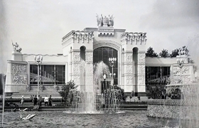 Первая версия павильона построена в 1939 году (полностью утрачена). Архитектурно представляла собой символический стальной мост над водным каскадом, в центральной части фасада грандиозное изображение Куйбышевской ГЭС. В правом части павильона стела с монументом В.И. Чапаева на коне. Павильон был декорированный горельефами посвящённым земледелию.