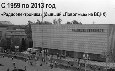 Павильон «Поволжье» который мы с Вами видим сегодня построен в 1954 году в стиле сталинского ампира по проекту И. В. Яковлева и И. М. Шошенского. Но уже в 1958 году павильон был реконструирован, а в 1959 году его переименован в «Радиоэлектронику». Поменялась тематика павильона, изменили и общий вид здания, историческое здание закрыли фальш-фасадом который был собран из металлических пластин и напоминал стилизованный радиоприёмник. Часть старого фасад был частично демонтировали.