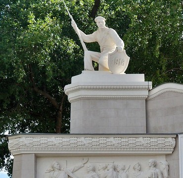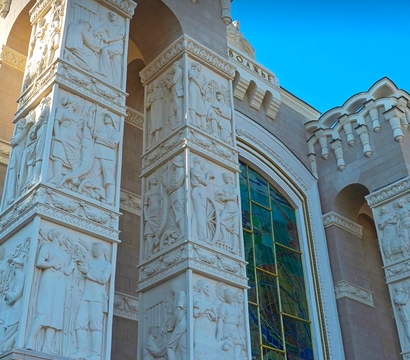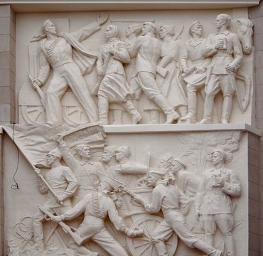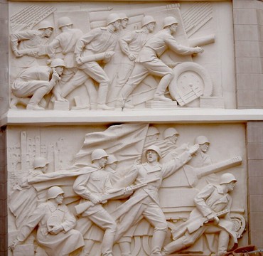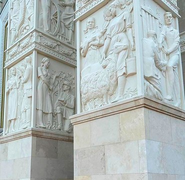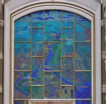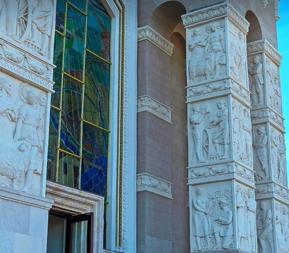 Павильон украшен горельефами с изображением солдат и матросов в сражений за Царицын (в Гражданскую войну) и Сталинград (в Великую Отечественную) На столбах барельефы с сценами мирного труда народа-победителя. В глаза бросается большой витраж в центральной части здания с изображением карты Поволжья, где нарисован Волго-Донской канал с обозначением Сталинградской и Куйбышевской ГЭС. На крыше в центральной части скульптура «Рабочий и колхозница» держут щит с звездой на щите изображение государственного герба СССР, по углам две скульптуры: матрос краснофлотец и солдата.