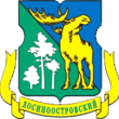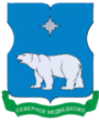 Щитодержатели: справа - золотой медведь, а слева - золотой лось, стоящие на серебряном мурованном акведуке.Внизу голубая лента с надписью серебряными буквами: Северо-Восточный Округ.