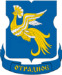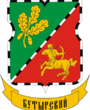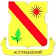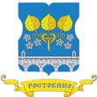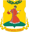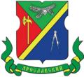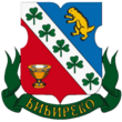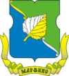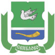 В голубом щите серебряная башня с острым шпилем, сопровождаемая по бокам: справа - серебряной розой, а слева - серебряным колосом.
