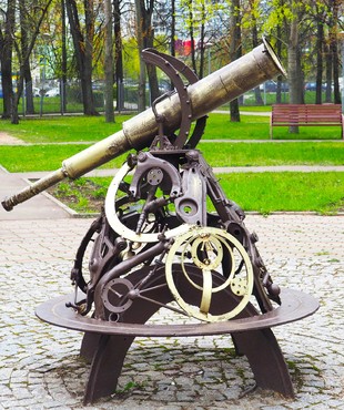 Композиция сквера устроена в форме круга, в центре которого размещен телескоп, от него отходят дорожки в концах которых размещены металлические фигурки знаков зодиака у каждого знака табличка с описанием.