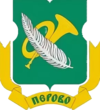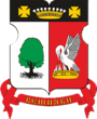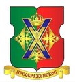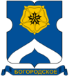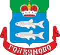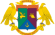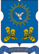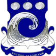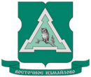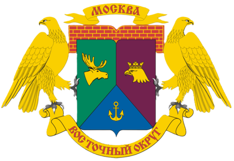 -Щитодержатели два золотых оглядывающихся сокола, сидящие на золотой ленте с надписью красными буквами: ВОСТОЧНЫЙ ОКРУГ.