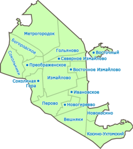 Делится ВАО на 16 районов: Богородское, Вешняки, Восточное Измайлово, Восточный, Гольяново, Ивановское, Измайлово, Косино-Ухтомский, Метрогородок, Новогиреево, Новокосино, Перово, Преображенское, Северное Измайлово, Соколиная Гора, Сокольники.