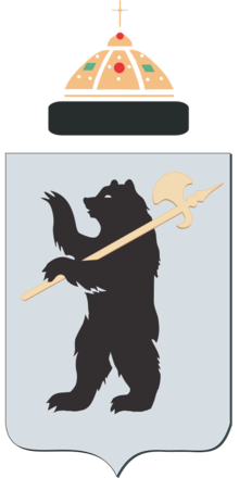 Описание герба: В серебряном поле геральдического щита восстающий развернутый вправо черный медведь, держащий на левом плече левой передней лапой золотую секиру, обращенную лезвием вверх; правая передняя лапа медведя приподнята над левой. Геральдический щит увенчан изображением шапки Мономаха.