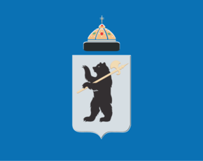 Флаг города Ярославль утвержден 22 мая 1996 представляет собой полотнище синего цвета с соотношением сторон 2:3. Геральдическая символика Ярославского флага полностью отражает герб города. В центре флага, герб города серебряный щит на щите располагается вставший на задние лапы медведь чёрного цвета. Он развёрнут вправо, правая передняя лапа поднята вверх на уровень головы. Левой передней лапой медведь держит жёлтого цвета секиру, которая древком своим покоится на его плече. Секира направлена лезвием вверх. На фоне синего полотнища, над серебристым щитом располагается изображение шапки Мономаха.