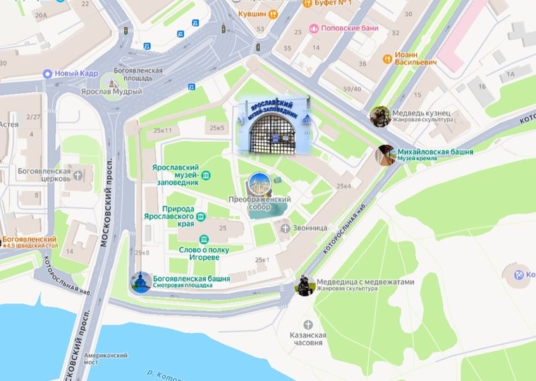 За стенами Спасо-Преображенского монастыря находятся музеи в которых Вам расскажут историю города Ярославля . Именно здесь располагаются основные экспозиции главного регионального музея‑заповедника. Тут на территории Вы можете посетить звонницу она же и смотровая площадка с нее открывается великолепные виды на Ярославскую набережную. Есть музей «Слово о полку Игореве» в нем расскажут о историю древнерусской литературы, чьи экспозиция размещается в интерьерах XVI века. Тут увидите Собор Преображения Господня это недействующий православный храм одно из старейших и сохранившихся зданий. Рядом соседствует Церковь Феодора, Давида и Константина Ярославских построенная на месте небольшой Иерусалимской церкви, обойдя эти два здания Вы увидите Часовню Трифона, епископа Ростовского, построенная в 1830 году представляет собой однокупольную часовню, так же достопримечательностью считаются Водяные ворота, служившие для повседневного использования. Водяные, потому что они выходили на набережную реки Которосль и через эти ворота носили воду в монастырь. На территории установлен монумент посвящён ярославской копейки в честь 400-летия чеканки. Мозаичная стела «Клятва князя Пожарского». Установлена к 1000-летию Ярославля в 2010 г.