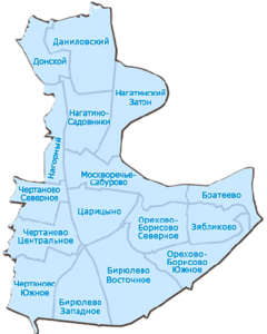 Делится ЮАО на 16 районов: Бирюлёво Восточное, Бирюлёво Западное, Братеево, Даниловский, Донской, Зябликово, Москворечье-Сабурово, Нагатино-Садовники, Нагатинский затон, Нагорный, Орехово-Борисово Северное, Орехово-Борисово Южное, Царицыно, Чертаново Северное, Чертаново Центральное, Чертаново Южное.